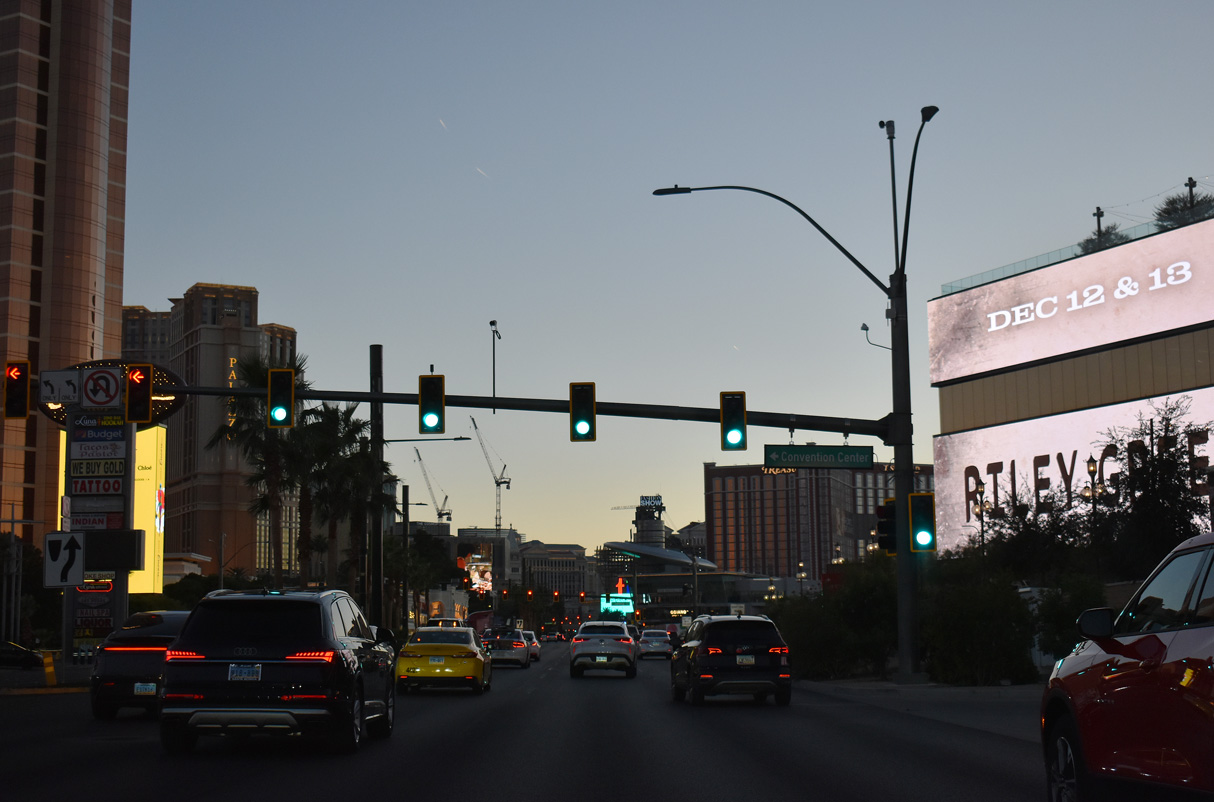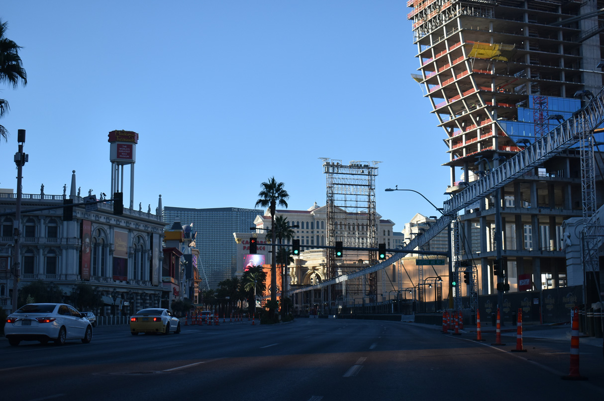 Las Vegas Boulevard at Harmon Avenue from the pedestrian bridge spanning the east side of their intersection.