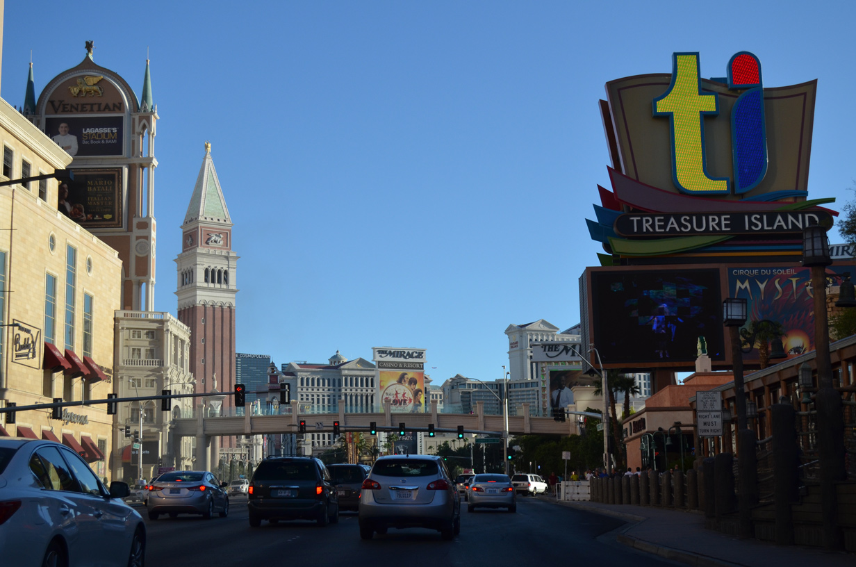 Passing by Treasure Island, Las Vegas Boulevard advances to the signals with Mystère Dreams Avenue west and the entrance to the Palazzo to the east.