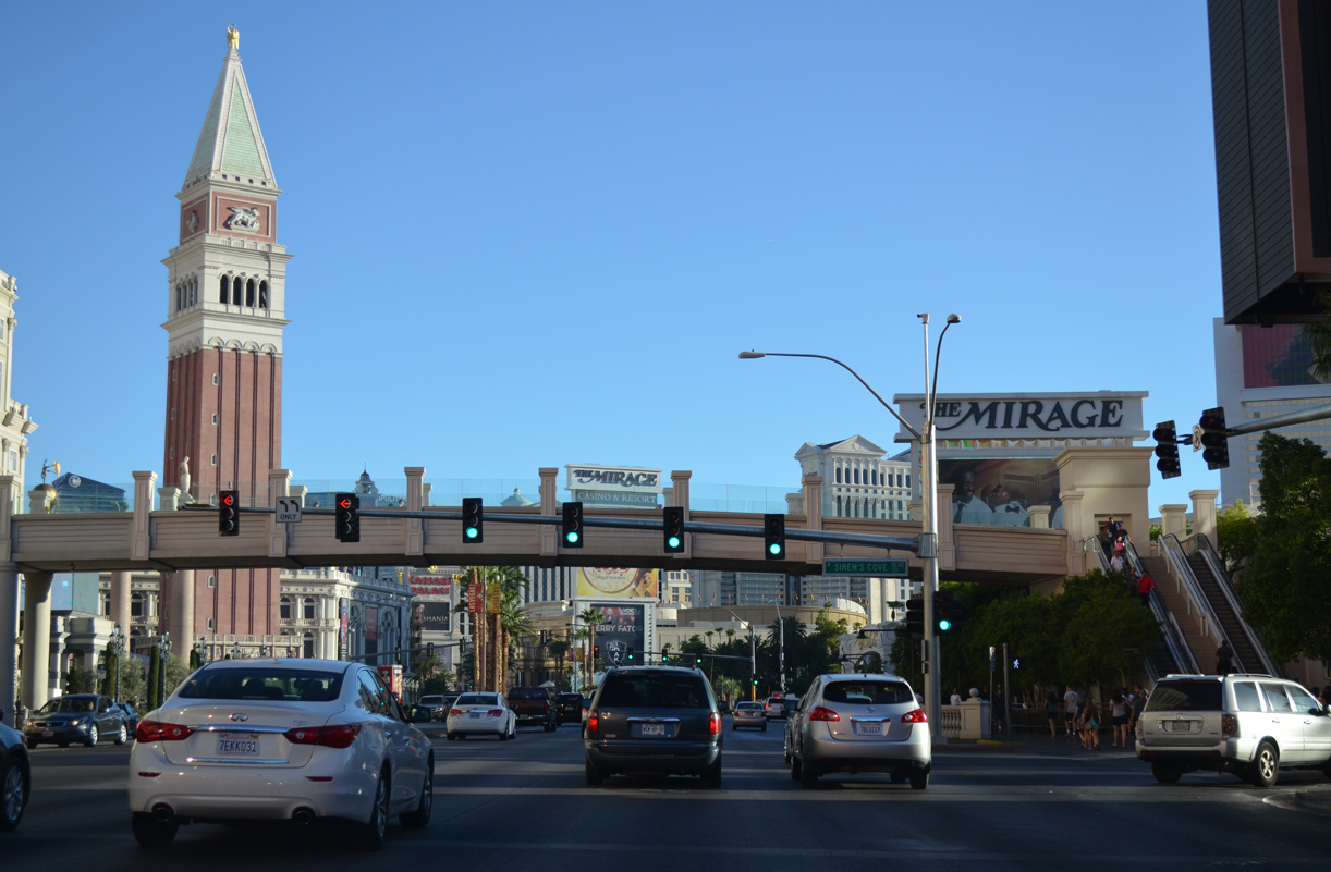 Viewing southbound Las Vegas Boulevard toward the Paris and Bellagio resorts from the pedestrian bridge spanning the arterial at Flamingo Road.