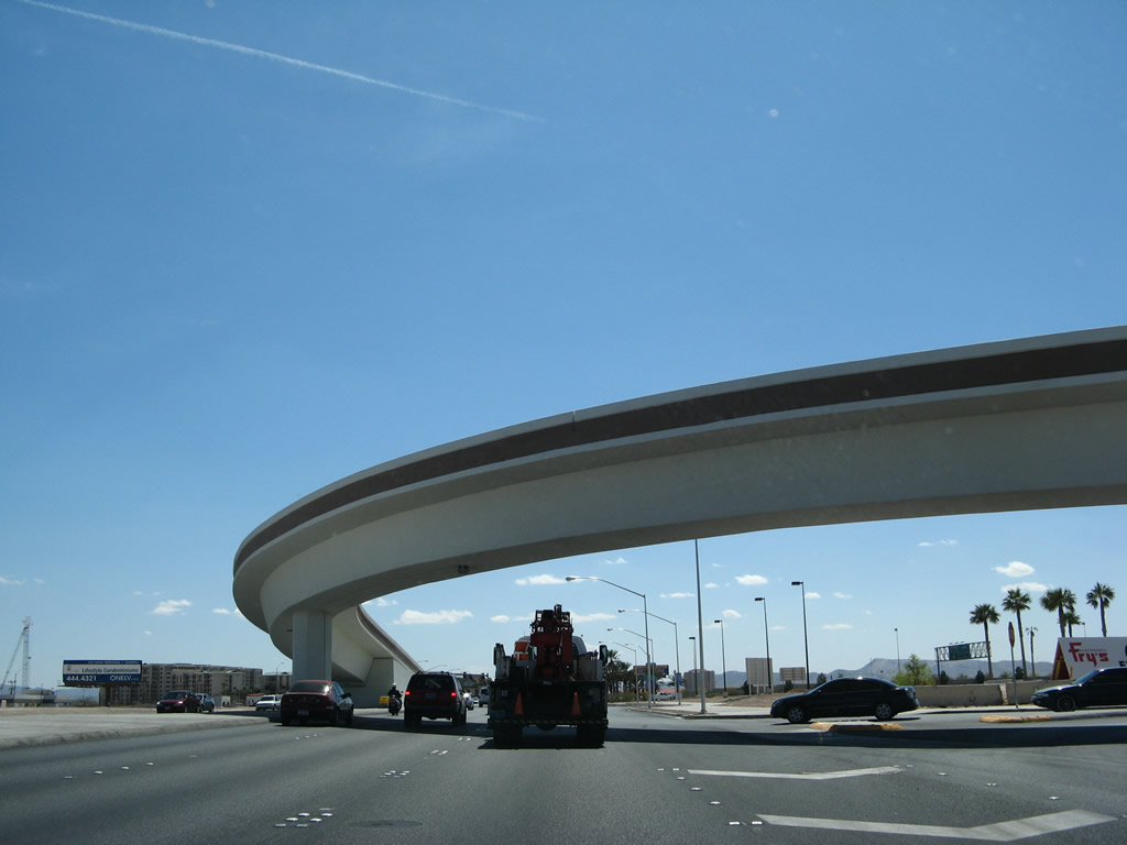The succeeding right turn from Las Vegas Boulevard south connects with ramps to both Interstate 15 north to Downtown Las Vegas and Clark County Route 215 west to Spring Valley and Summerlin.