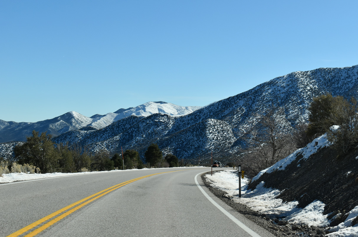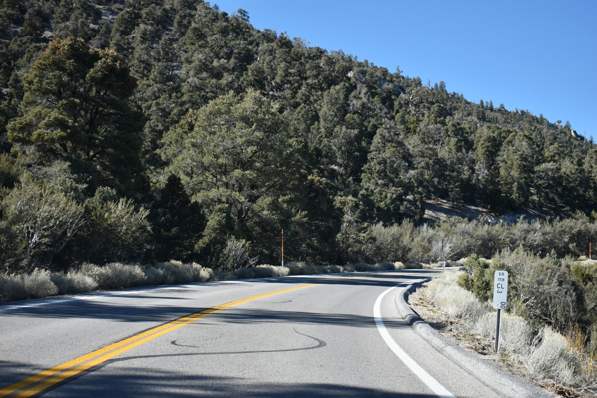 State Route 158 angles 8.85 miles southeast along Deer Creek Road from SR 156 northeast of Lee Canyon on Mount Charleston.
