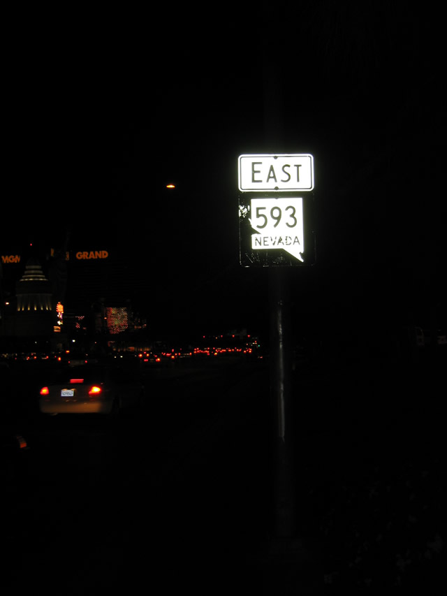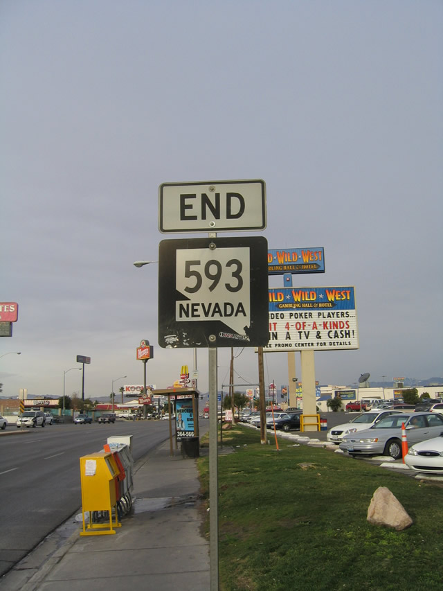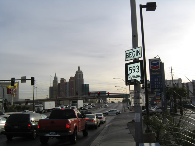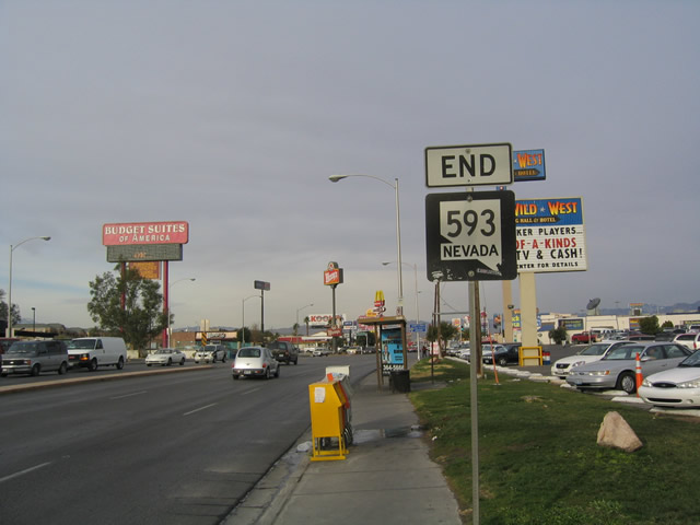 An end Nevada 593 shield was posted along westbound Tropicana Avenue at the intersection with Dean Martin Drive (former Industrial Road) beyond Interstate 15.