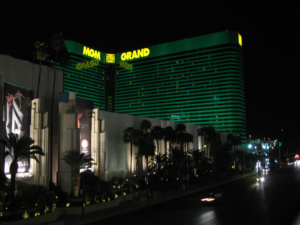 The green-hued MGM Grand resort and hotel comes into view on the north side of Tropicana Avenue.
