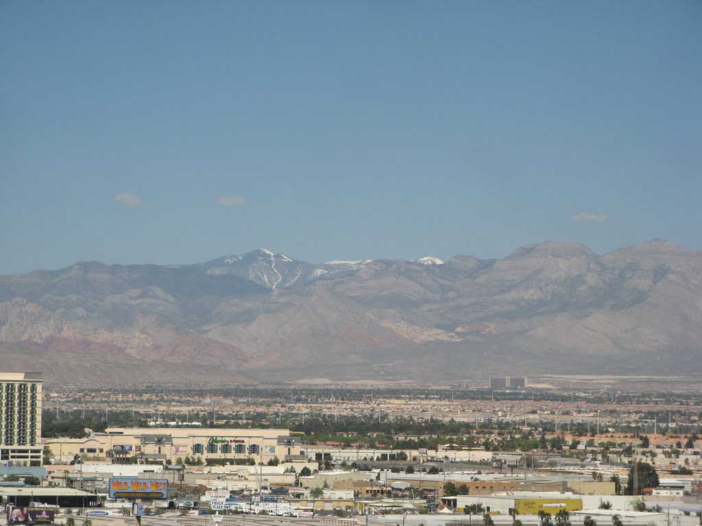 The Spring Moutains west of Las Vegas are visible on most days from westbound Tropicana Avenue. Red Rock Canyon National Conversation Area can be seen in the foothills of these mountains. This view is also afforded from the Excalibur resort.