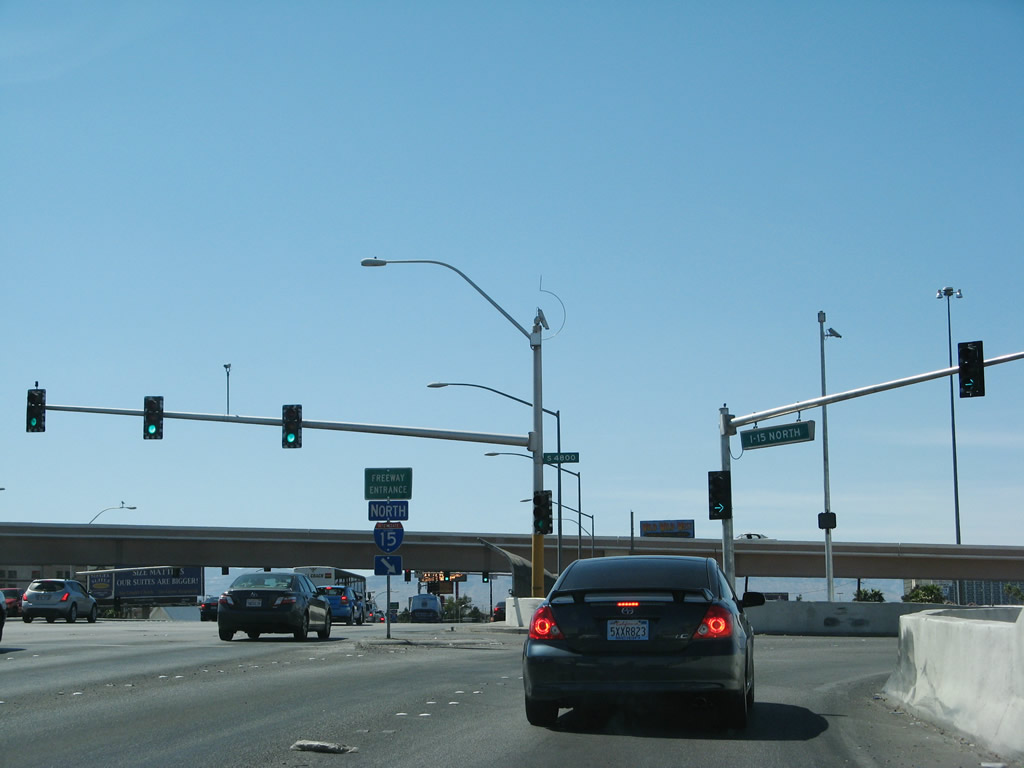 Interstate 15 shields posted along eastbound Tropicana Avenue prior to the southbound entrance ramp to Los Angeles.