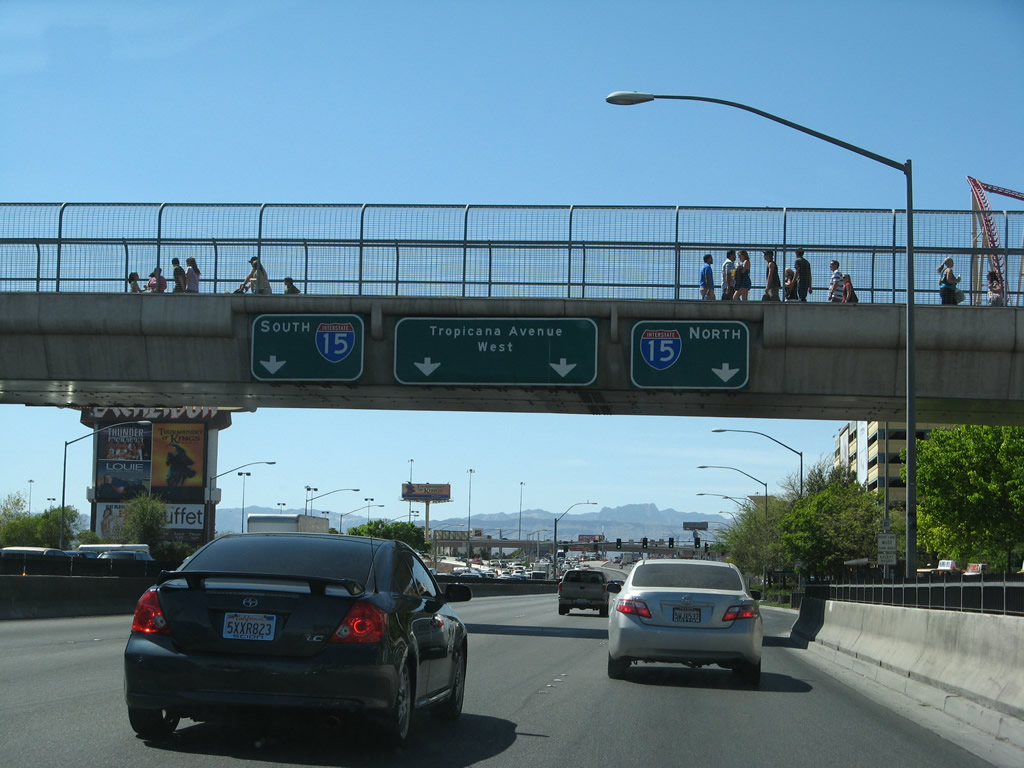 Eastbound Tropicana Avenue at Interstate 15. The right lane exits onto Interstate 15 south to Jean, Primm, and Southern California (with a control city of Los Angeles).