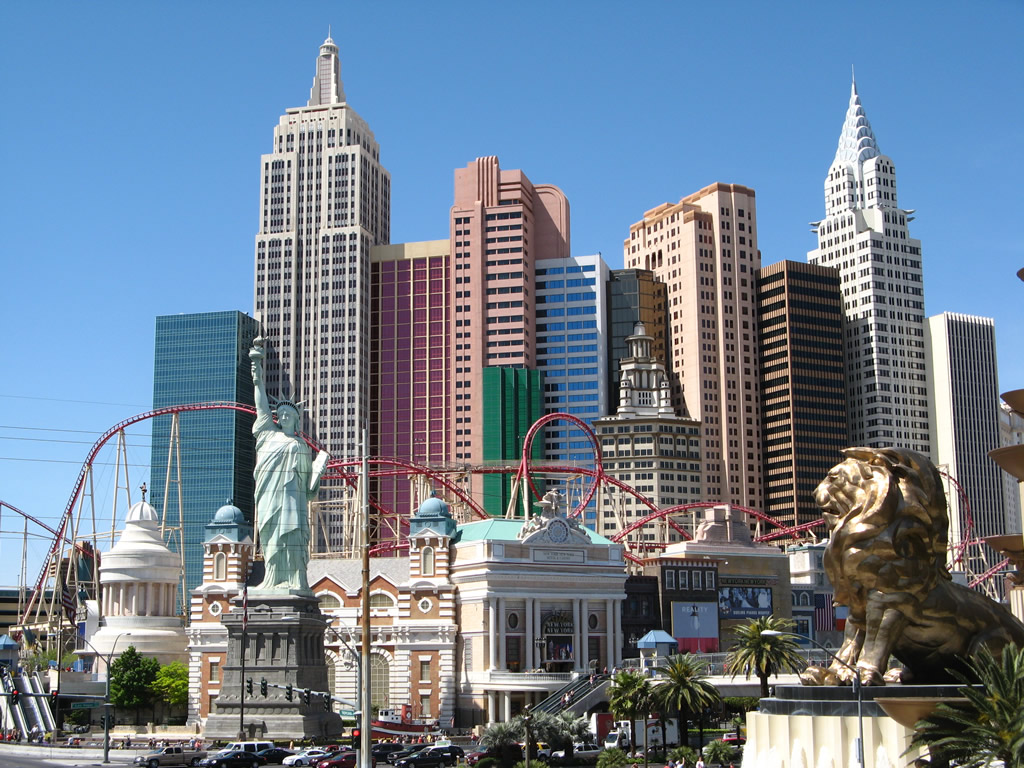 A slightly angled view from the pedestrian bridge offers a full view of the New York New York resort skyline.