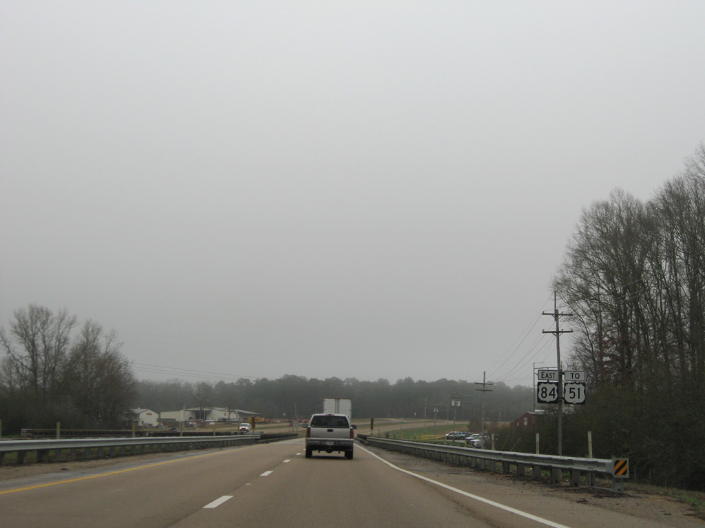 U.S. 84 converges with U.S. 51 at an four-way stop sign intersection. 2002 traffic counts here were just 9,100 vehicles per day (vpd) for U.S. 84 in 2002 and 7,800 vpd for U.S. 51.