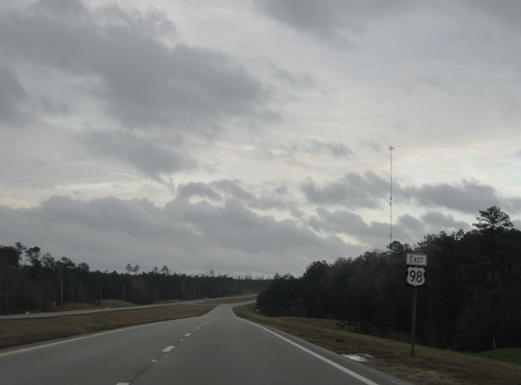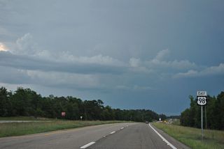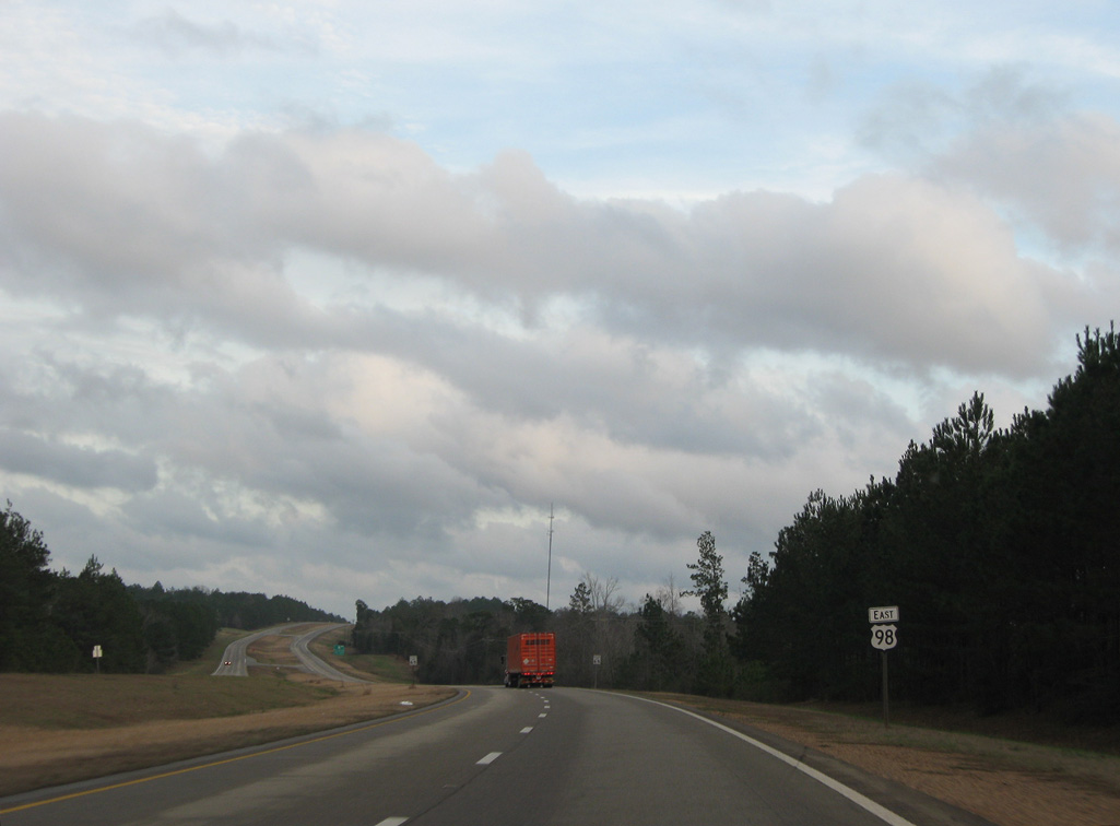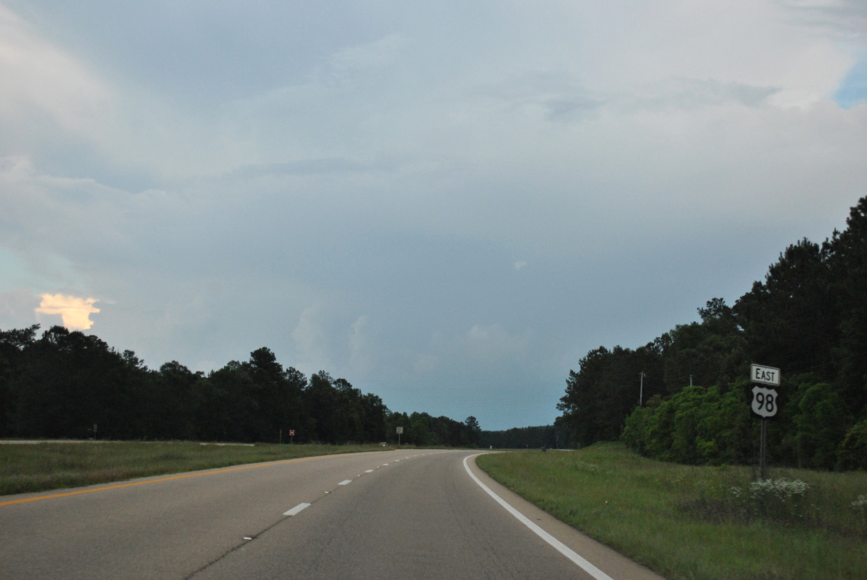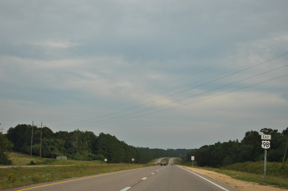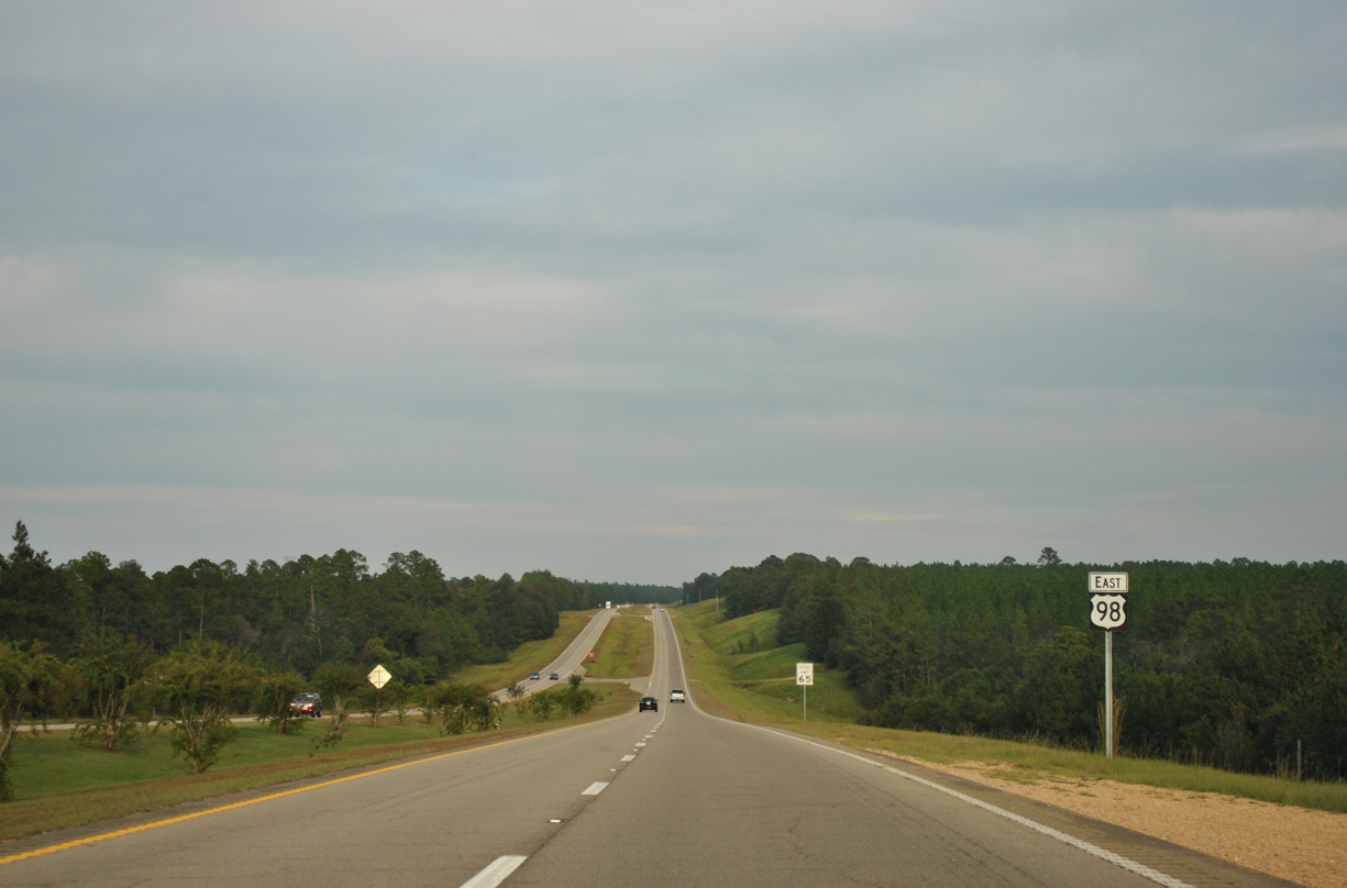U.S. 98 east separates from Interstate 59 south at a rural trumpet interchange just outside the Hattiesburg city limits.