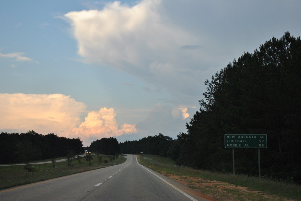New Augusta is another 14 miles east along U.S. 98 while Lucedale is actually 49 miles away, despite this distance sign referencing the city at 52 miles. Mobile, Alabama is 87 miles to the southeast instead of 82.