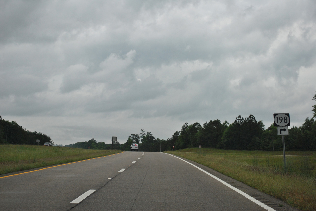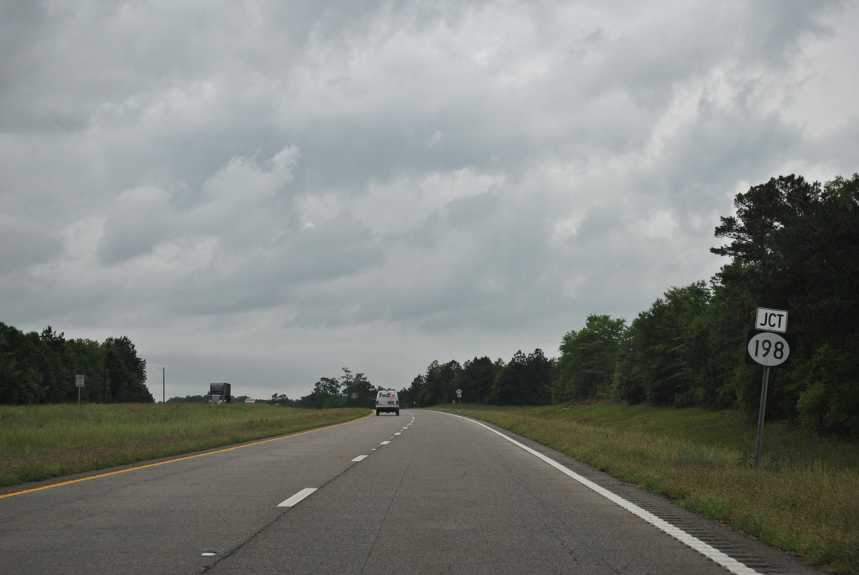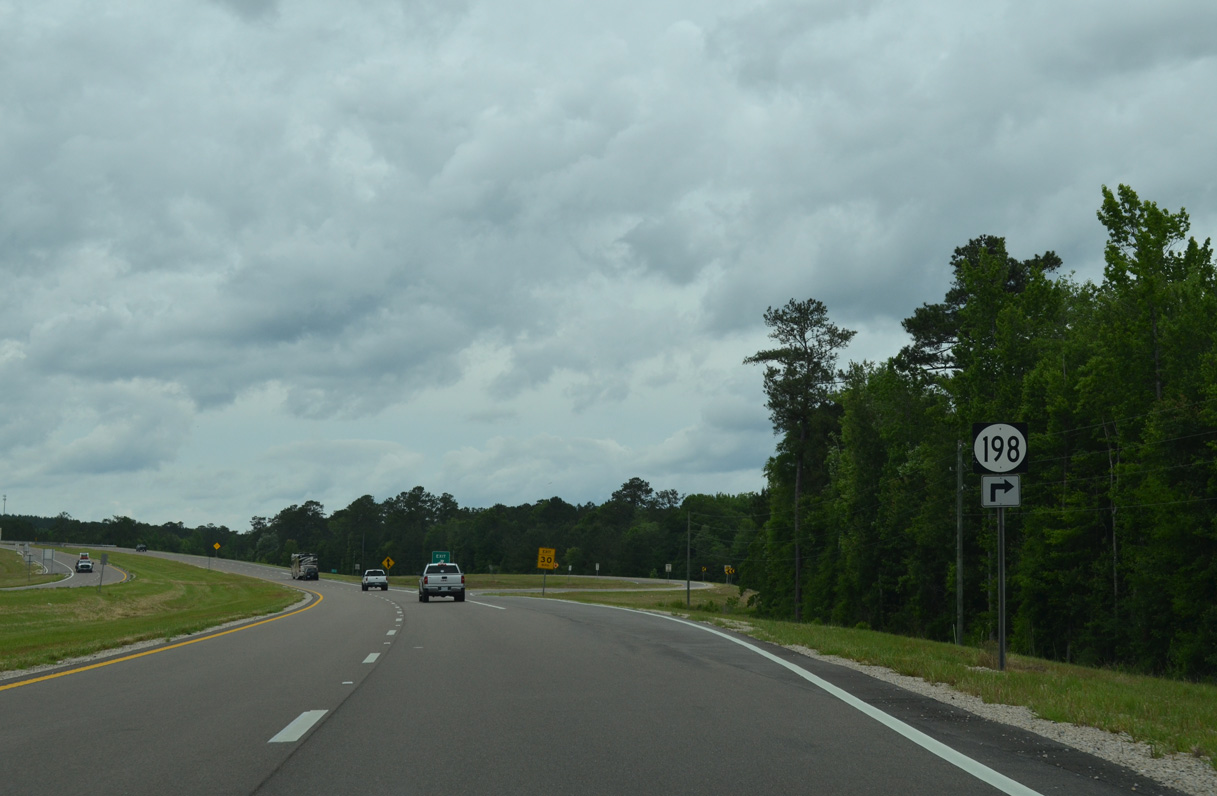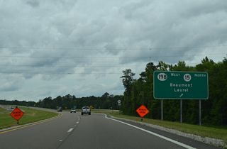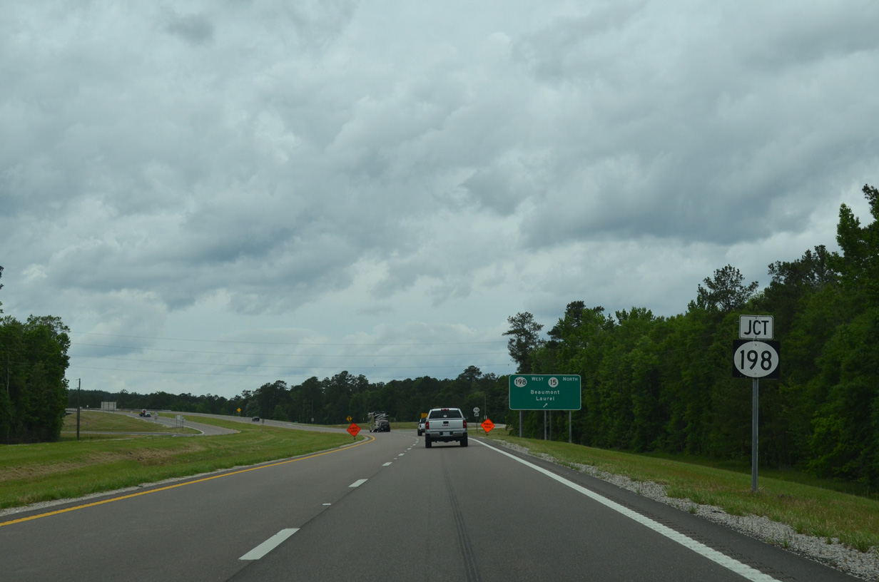 MS 198 north into Beaumont commences from a folded diamond interchange along U.S. 98. The exchange is east of the CN Railroad.