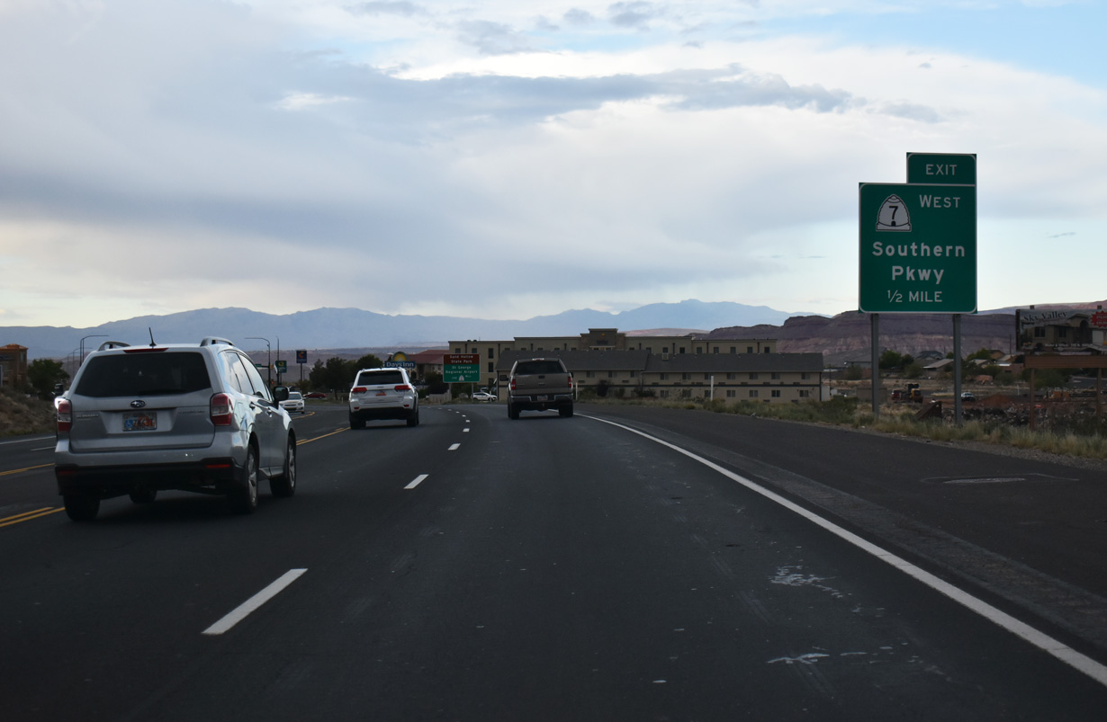 SR 7 (Southern Parkway) is a 26 mile limited-access route located generally to the east of both Washington and St. George. The west end of Southern Parkway ties into I-15 near the Arizona state line.