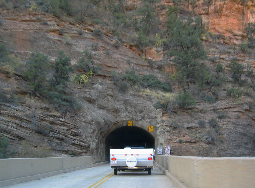 Leaving the Zion-Mount Carmel Tunnel westbound. Vehicles sized 7'10" in width or 11'4" in height, or larger, must have an escort through the tunnel.