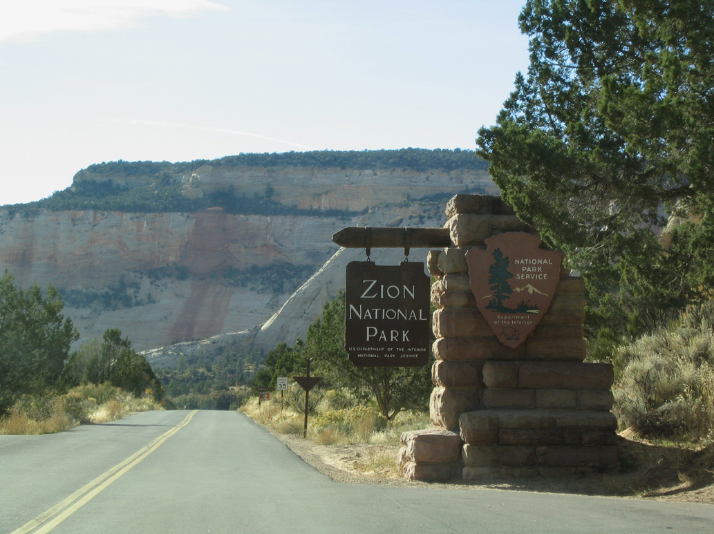 Upon entering Zion National Park, SR 9 changes into the Zion-Mount Carmel Highway. This entrance sign is the last chance to turn around before paying the park entry fee per vehicle.