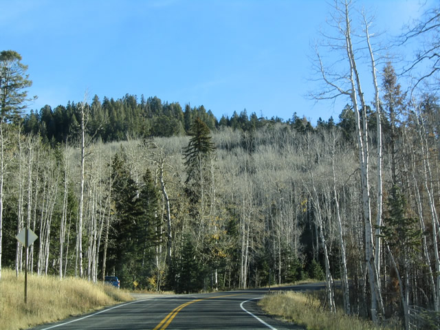 This alpine meadow is part of the flat top of the Markagunt Plateau, and it is surrounded by trees. The deciduous trees in the forest are not dead; they have already lost all of their leaves in anticipation of winter. Since this was a dry autumn, no snow was present yet in the meadow or forest. That changed shortly after we departed this area.
