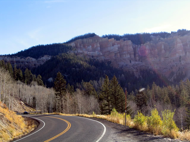 As Utah 14 ascends from Cedar City (elevation 5,800 feet) to Midway Summit (elevation 9,896 feet), it passes through some dramatic scenery including several tall cliffs, mountain terrain, and alpine forests. This area is part of the Dixie National Forest, which includes several discontinuous units in southern Utah.