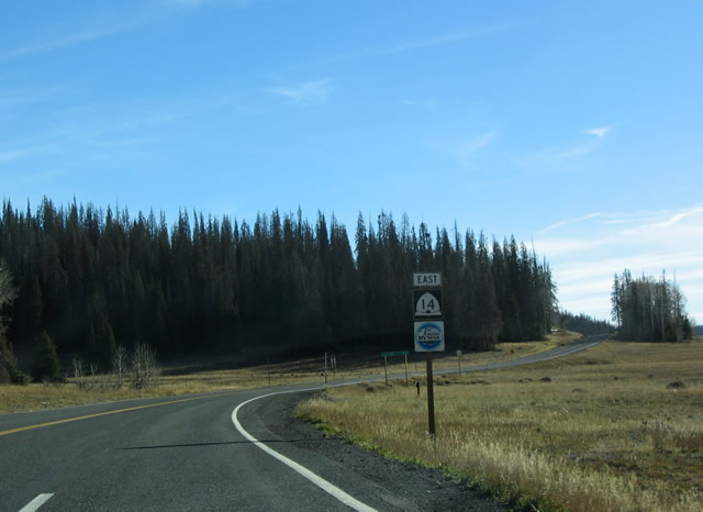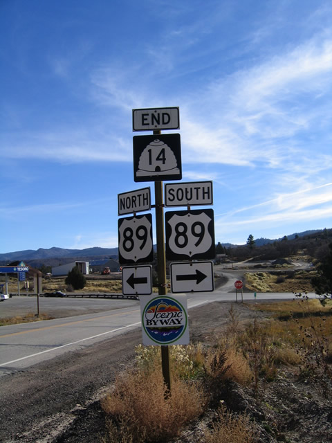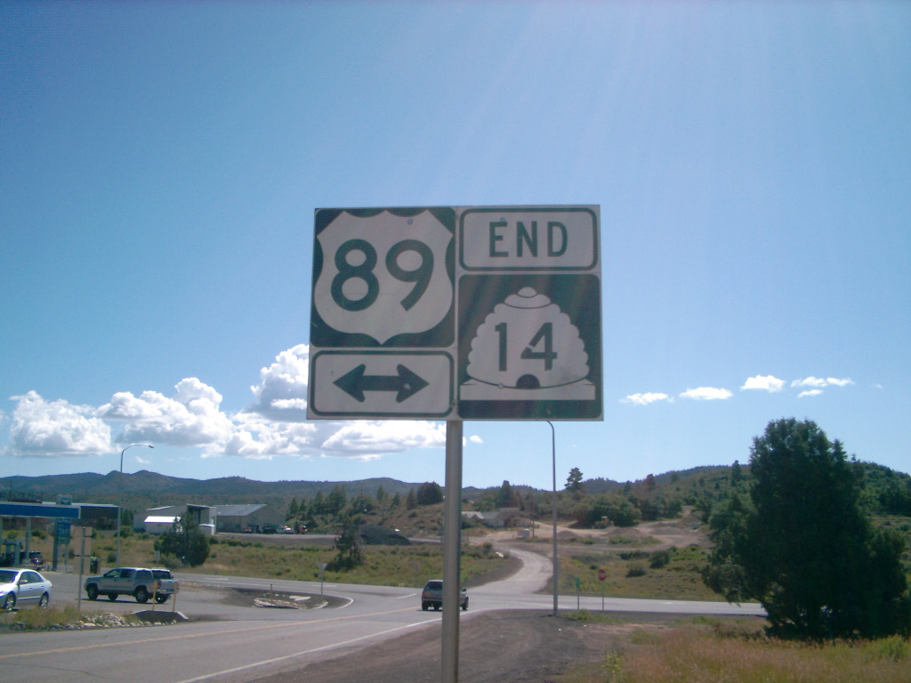 In 2003, the end Utah 14 east shield was flanked by two U.S. 89 shields, one for each direction. This changed by 2009. The scenic byway continues in both directions along U.S. 89.