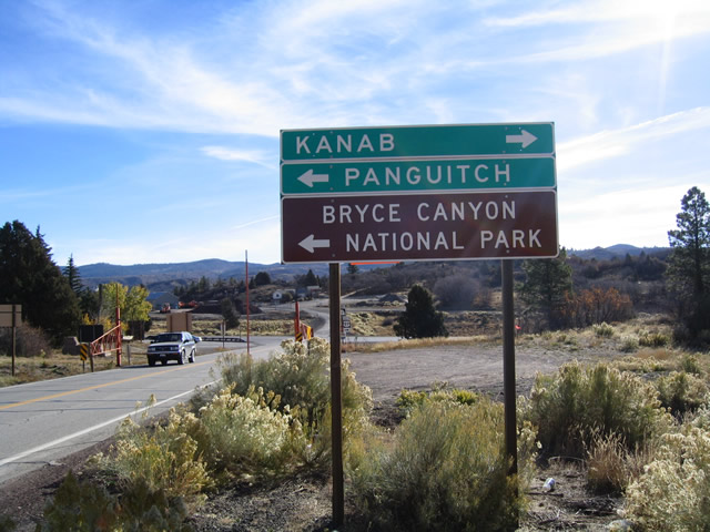 Eastbound Utah 14 approaches its junction with U.S. 89 in Long Valley Junction. U.S. 89 leads south to Kanab (and Zion National Park) and north to Panguitch and Bryce Canyon National Park.