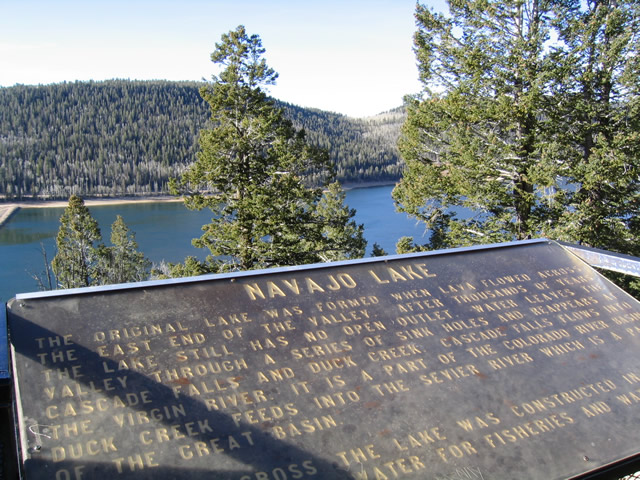 Signage for Navajo Lake along Utah 14. Navajo Lake drains into the Colorado River Basin, while nearby Duck Creek drains into the Sevier River drainage, which is part of the Great Basin. Utah 14 forms a divide of sorts, with drainage to the south generally flowing into the Virgin River and drainage to the north flowing into the Sevier River (with some exceptions closer to Long Valley Junction).
