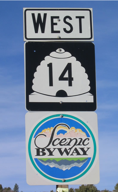 Utah 14 east and scenic byway shield after the Utah 148 intersection in the heart of Dixie National Forest.