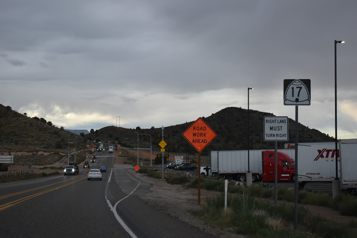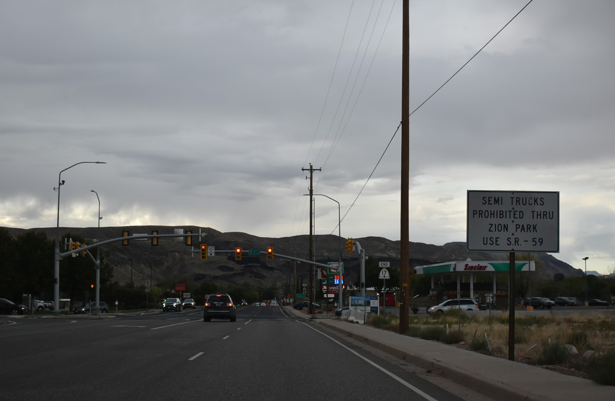 East from SR 17, SR 9 travels 20.22 miles to the Zion National Park entrance. The 12.11 miles of the route across the park are part of the National Park Road System and as such prohibit semi trucks.