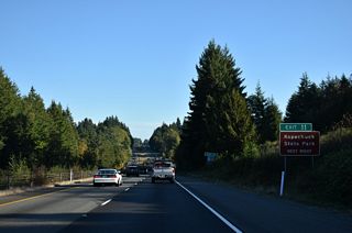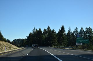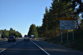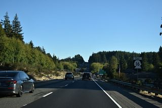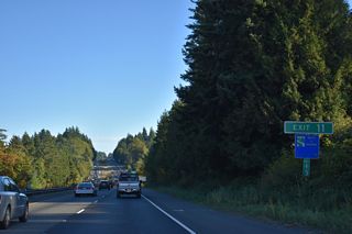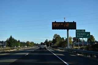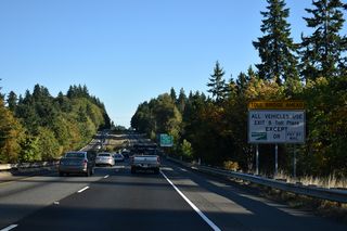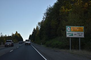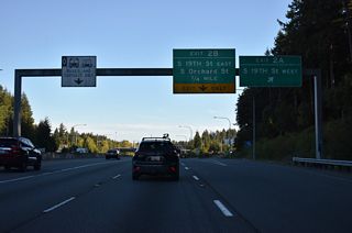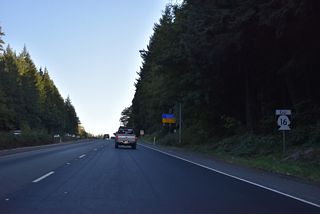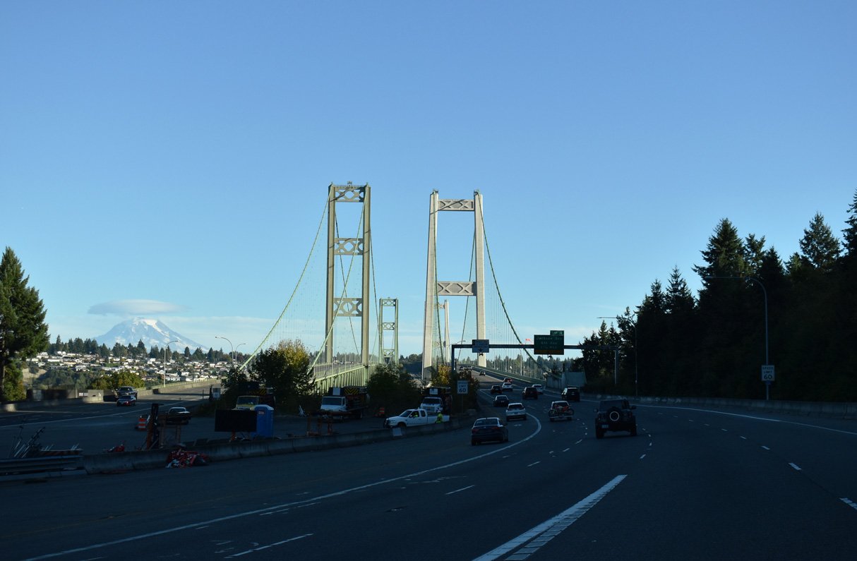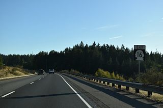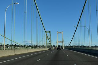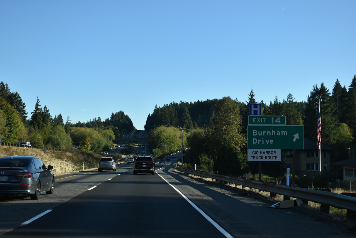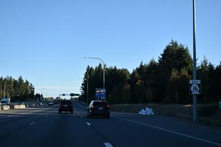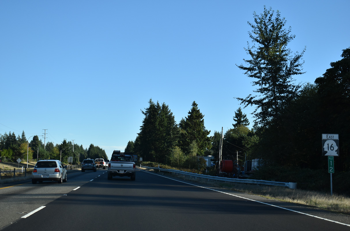 Heading south along SR 16 east from Gig Harbor toward the Tacoma Narrows Bridge. The left lane is restricted to HOV-2 motorists.