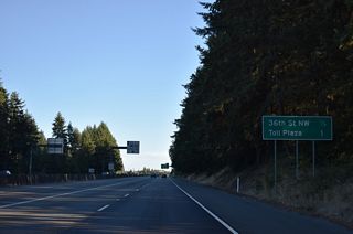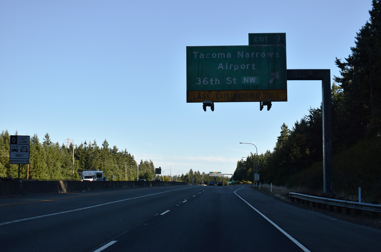 Exit 9 provides the last departure point before tolls are collected for the Tacoma Narrows Bridge. The RIRO (right in right out) ramps connect the freeway with 36th Street SW west to Point Fosdick Drive NW north of Tacoma Narrows Airport (TIW).