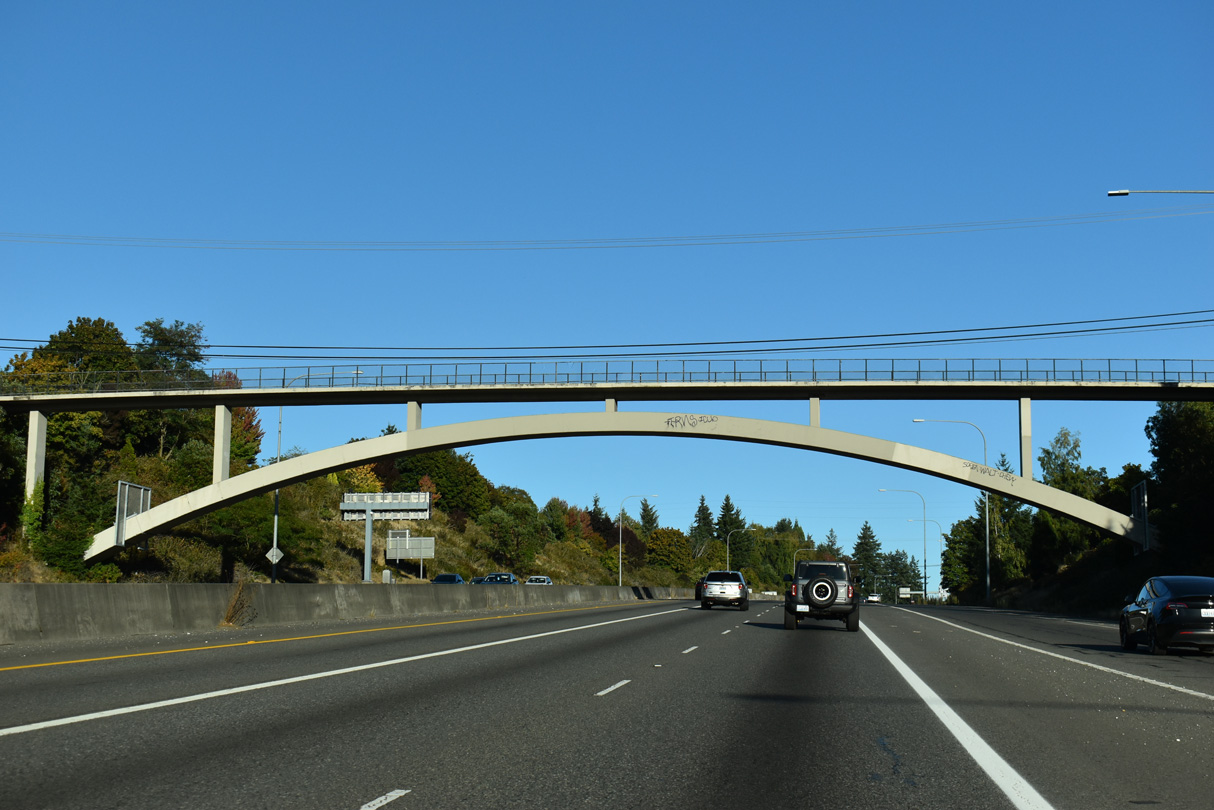 Continuing east, SR 16 passes under an arched pedestrian bridge connecting segments of Skyline Drive nearby.